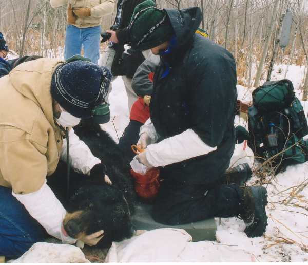 On March 4th, Biologist Gappa approaches the den and uses a syringe mounted on a jab-stick to immobilize the sow. He pulls the four bewildered cubs from their home for weighing and safe-keeping in the warm jackets of observers. The sow is pulled from the den. In the cold and wide-open spaces, Riley and Vogel, with assistance from Graduate Students Brian Curry and Dave Baewer methodically go through the familiar process of taking fat and muscle tissues and blood samples from Mama Bear.