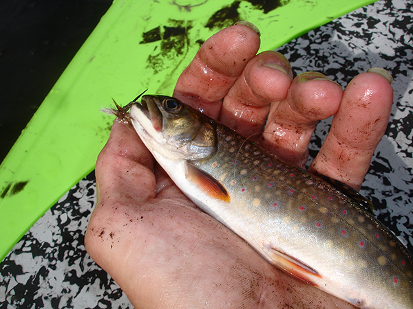 The submerged ruins of a beaver dam lay directly over white patches of sand where the spring water rose in the center. Ample cover and a constant upwelling of icy water; there were hundreds of brook trout darting over the logs and the sand. As I floated over, the bottom was literally alive with movement. I anchored in the muck with my legs dangling over the side of the board, giving myself ample room for a back-cast. As the evening rise began, I played out line. For the first time since I’d discovered it, I dropped a gentle fly right in the center of the lost pond. And then…