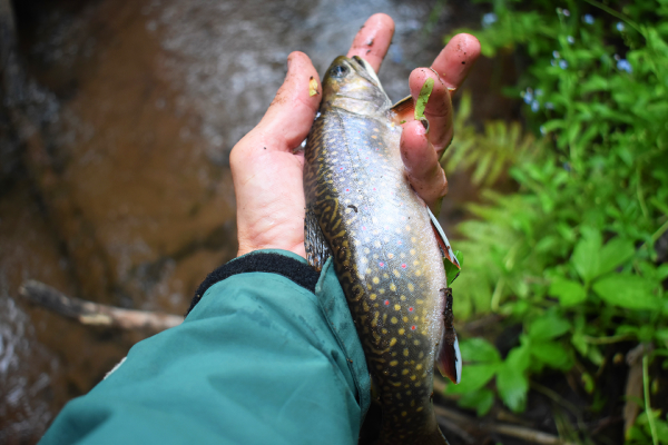 Trout smashed at flies in every seam. They were crowding each other out to get the chance. I missed strike after strike and tangled again and again in the brush. Every now and then I got lucky and hooked one squarely. They were all brook trout with dark spotted sides and purple maps across their back.