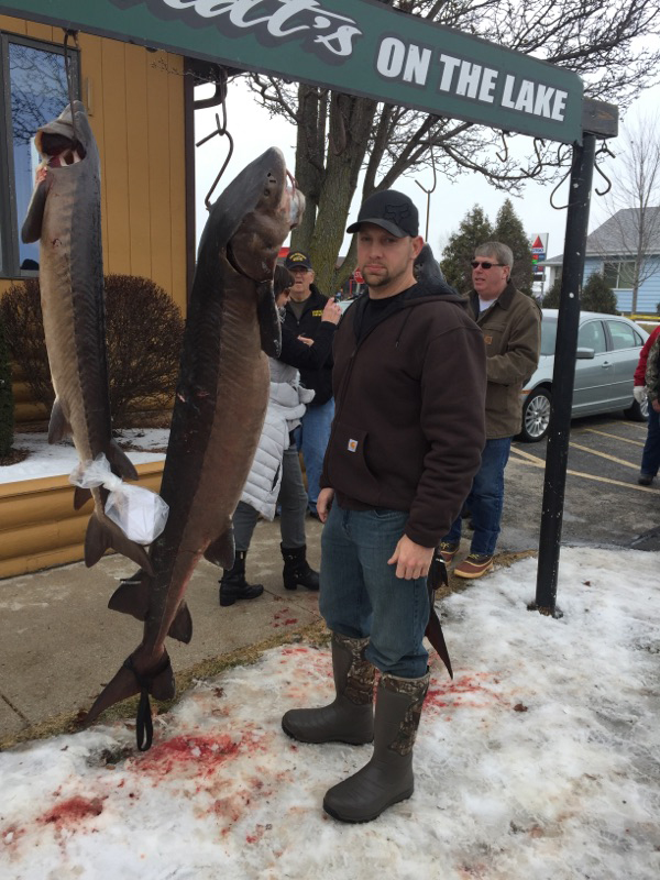 The big fish trend continued today with 8 fish larger than 100 pounds being harvested from Lake Winnebago. Today’s biggest fish was 140.6 pounds, 78.9” and registered by Michael Larson from Seymour (photo attached). Through the first 2 days of the season there have been 23 fish 100 pounds or larger harvested from Lake Winnebago (7.3% of harvest) and 4 from the Upriver Lakes (2.2%).