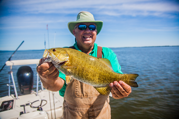 A smiling gent named Benny from Arkansas poses with a nice Chequamegon Bay smallie. According to Anglers All fishing guide Luke Kavajecz, who took Benny out on the lake, “We had to keep moving around this day to find the fish, but the action was steady and the weather was great.” (Photo courtesy of Luke Kavajecz)